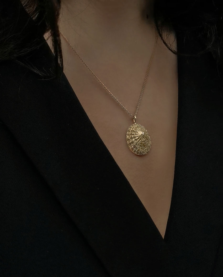 Vedhænget i halskæden er en direkte afstøbning af en udsøgt havsnegl fra Patellaslægten, fundet ved Jammerbugten. Skallen er kreeret af bølgernes dans, der antyder dens levested blandt klipper. Rå og uforfalsket som et stykke drivtømmer formet af strømmen. Vedhænget er ligesom skallen ikke skabt til at blænde, men til at camouflere og falde i ét med havbundens hemmeligheder. En stille pryd og ubesungen skønhed i det uperfekte. Hvor vedhænget spidser til, afsluttes smykket med en lille hvid topas.