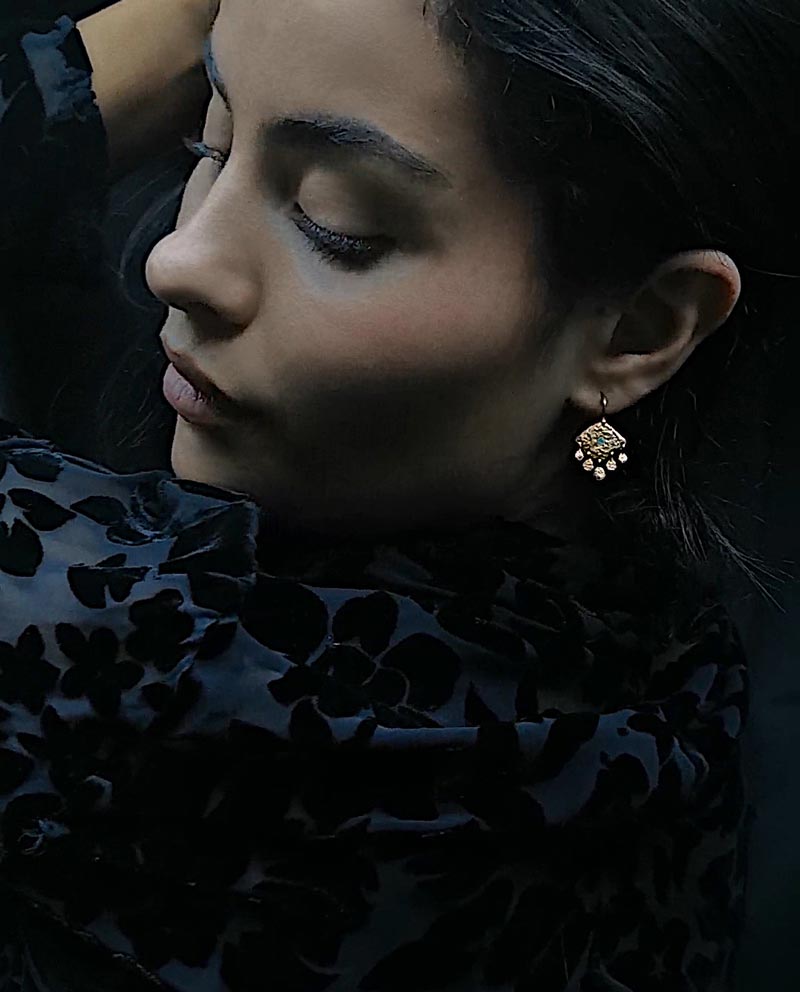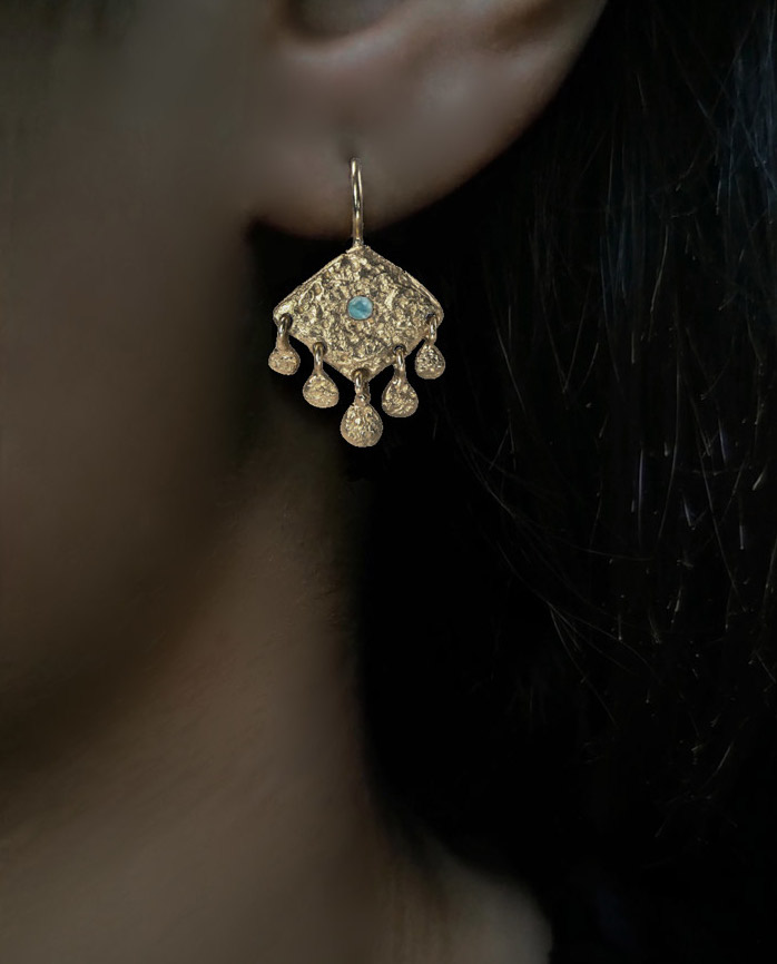 Øreringenes kvadrater slutter i fem fine blade, der synkront følger hver af bærerens bevægelser. De er petite og lette, men er – i kraft af deres mange detaljer – meget synlige. Når lyset rammer den kuperede overflade, danser det i tusindfacetterede genskær. Smykket er inspireret af Romertidens kultur, der byggede på proportioner og harmoni. Fra smykkets centrum stråler en fin lyseblå apatit.