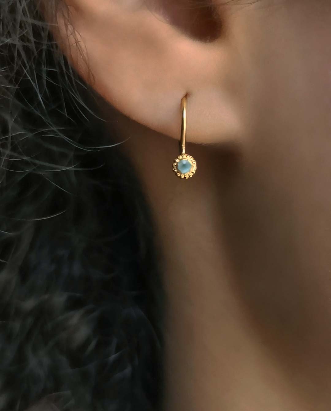 Den lyseblå douce sten underbygger det lille smykkes diskrete temperament. Netop det antydningsvise befordrer smykkets eksklusive karakter. Mens ørekrogenes cirkelrunde design får øreringen til at falde ind til øret helt, som det skal.
