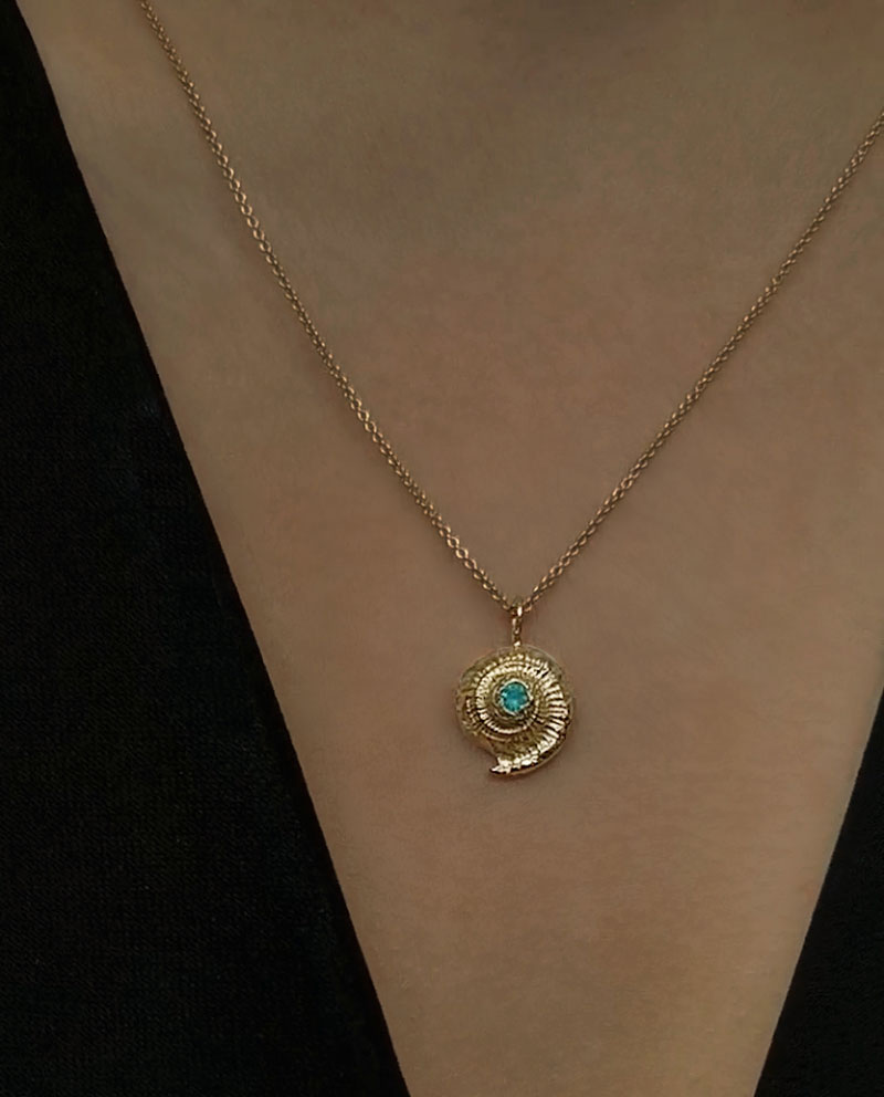 Halskædens vedhæng har aftryk der kan minde om et flere millioner år gammelt ammonit-fossil. Smykkets riller og kamme formidler en skulpturel kvalitet, der understreges af den gyldne hvirvel, som trækker øjet ind mod sit centrum. Der er en blødhed i fossilens kanter, som om det stadig husker havbundens sand og sten. Smykket samles i spiralens højeste punkt af en onyx, der reflekterer nuancer af havgrønt.