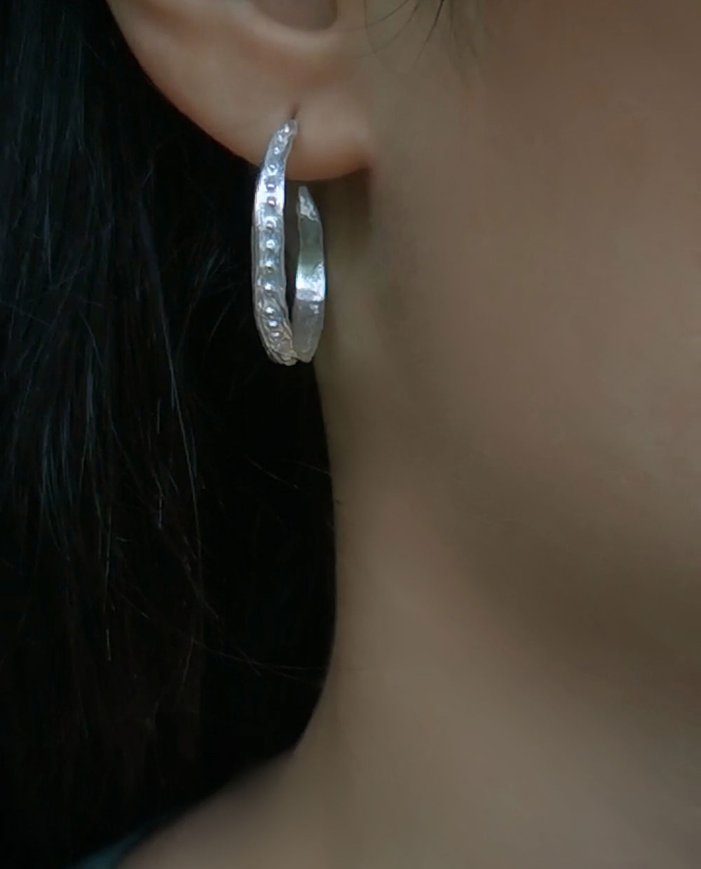 Kreolernes mønster er uregelmæssigt spredt som spor efter et skybrud på en stenet sti. Hver en bule, hver en fordybning fortæller om håndens bevægelse, materialets modstand og formbarhed. Bæreren bliver det lærred, hvor de små sølvskulpturer interagerer med huden, håret og øjnenes farve – og sådan bliver hoopsene et spejl, der reflekterer det ydre og det indre hos den, der har dem på.
