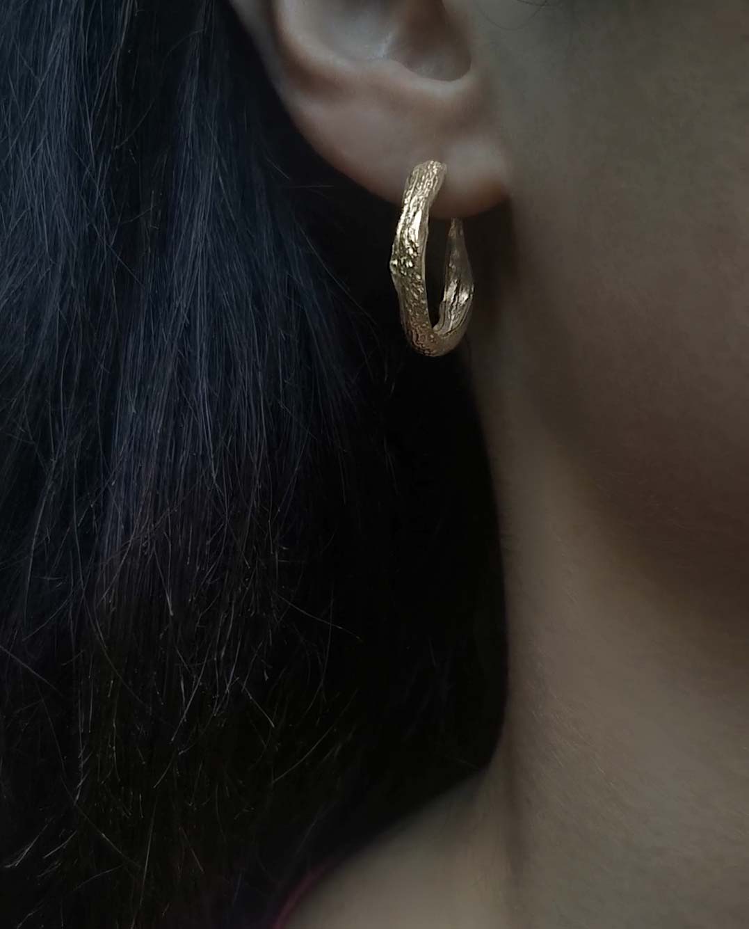 Kreolerne er som fragmenter af et danefæ gravet op i en forhistorisk eng. Teksturen er inspireret af barken på et ældgammelt egetræ – og ender som her, som om overfladen udgør en levende skulptur af mikroskopiske bjerge og dale. Øreringene er netop ikke skinnende, alligevel stråler de, men det er med den dybe, iboende skønhed, der findes i, hvad der er oprigtigt. Smykket indrammer dit ansigt med et vidnesbyrd om det unikke, der opstår, når natur og menneske mødes.