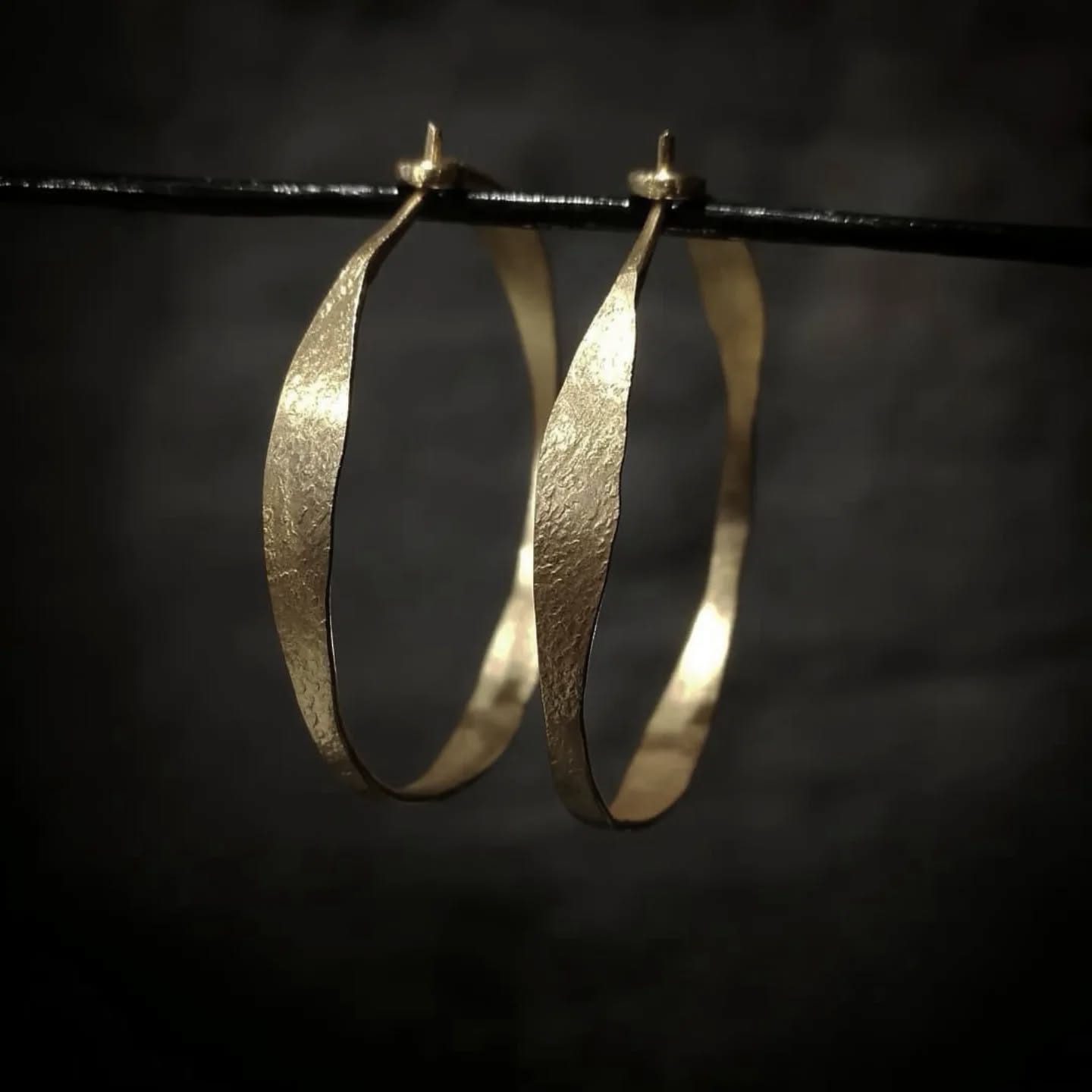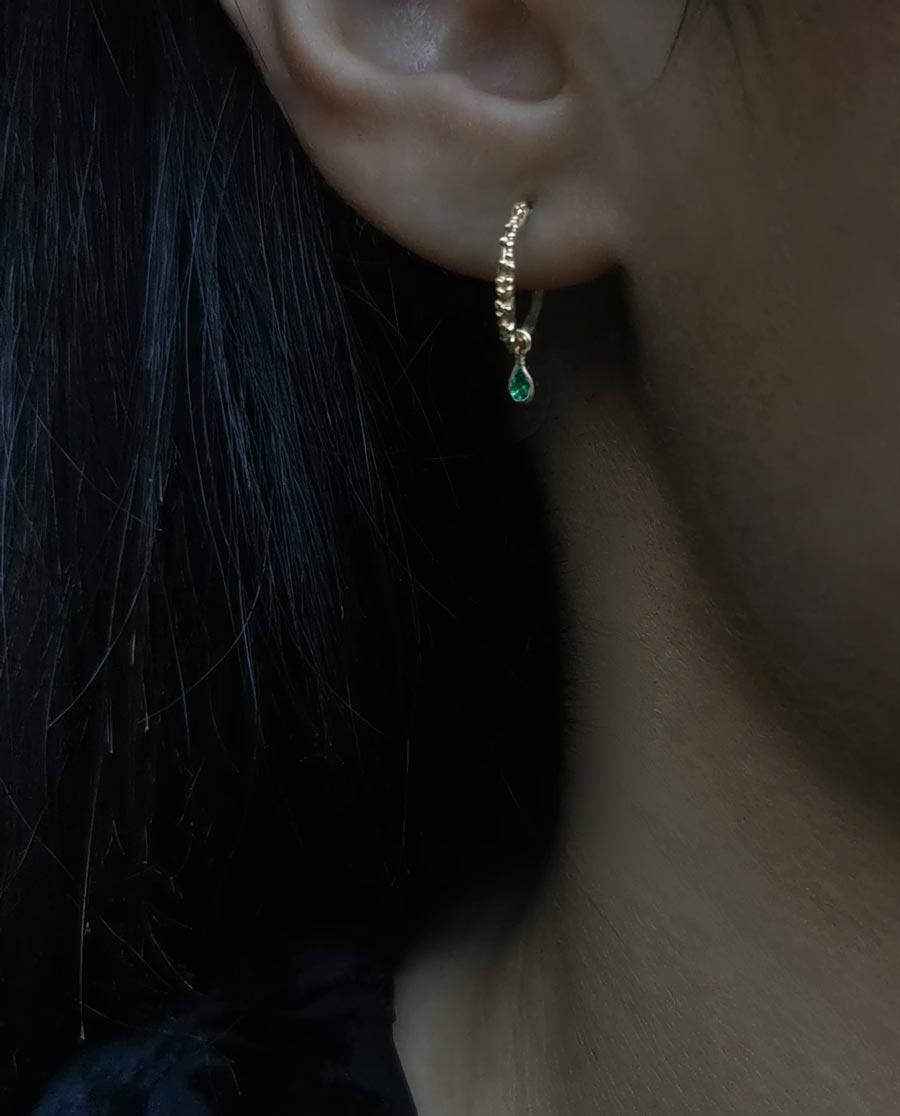 Overfladen på de små kreoler er dækket af tætsiddende knopper, tilfældigt sammensat, som et løfte om vår. Fra de nuprede grene hænger to skinnende dråber, der har samlet sig som morgendug fra de spæde skud og reflekterer dagens første stråler. Kreolernes løbebane sænker de indfattede onyx’ bevægelse med en elegant forsinkelse.