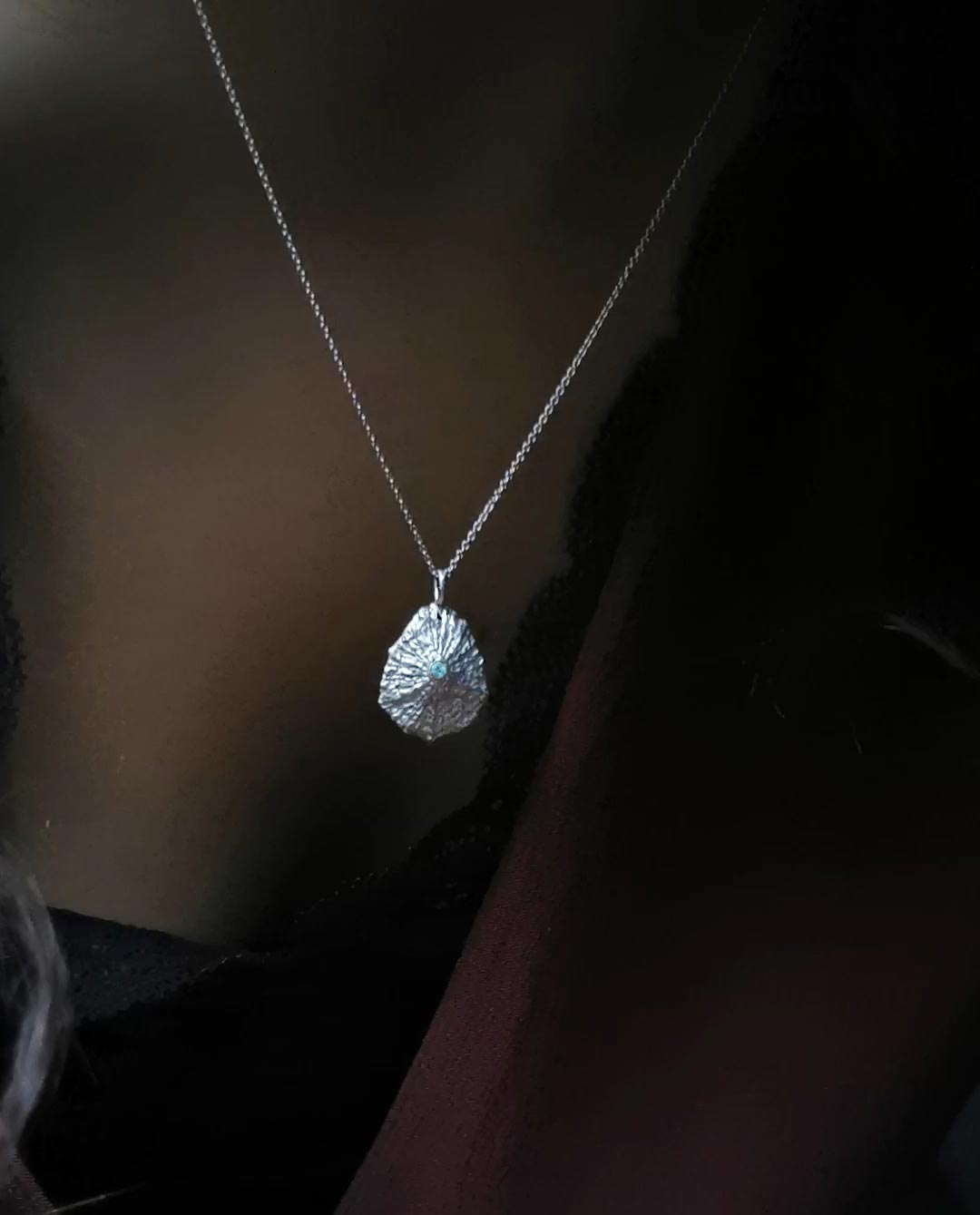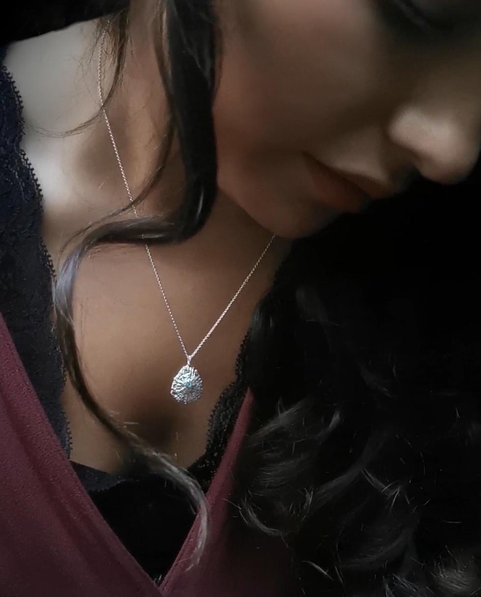 The silver necklace is inspired by the sea snails that cling to rocks and net piles along the Danish coasts. The surface reflects the shell’s thousands of encounters with tide and wind to finally wash up on a shore. A piece of jewelry distilled into a poetic work of art that whispers of the calm life below the surface of the sea. At the peak of the shell, an apatite rests like a drop of heaven reflected in the sea.