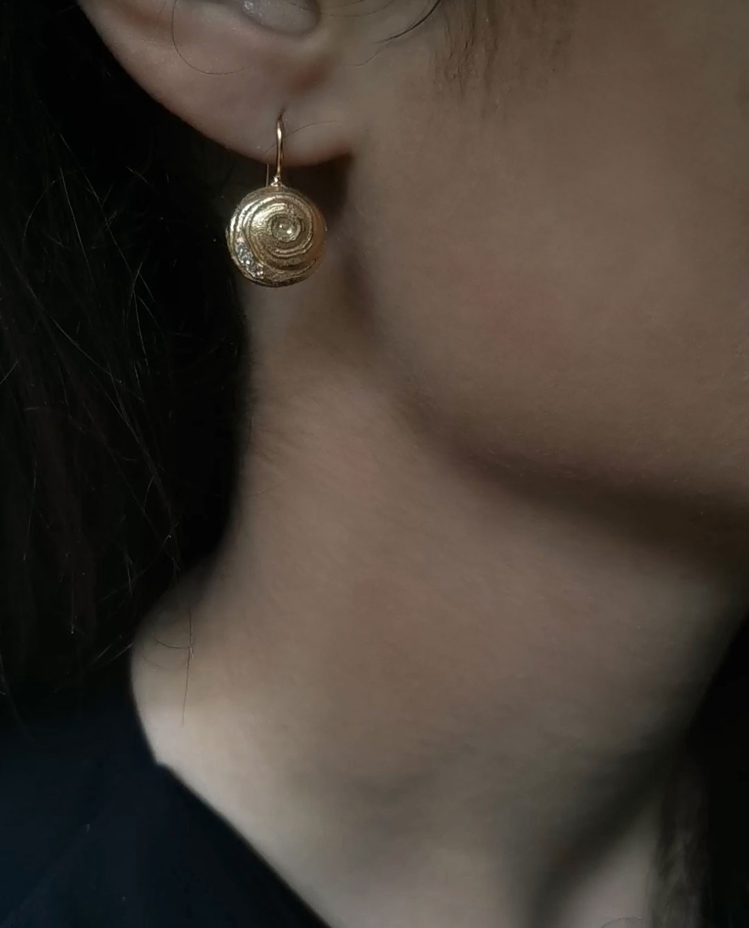 Øreringene er inspireret af danske solsnegle, dog har jeg tilladt mig nogen kunstnerisk frihed i kreationen af sneglehusets cirkelformede bane. Smykket er min hilsen til dette æstetiske naturvidunder. Langs siden er øreringene prydet med tre hvide topas på linje.
