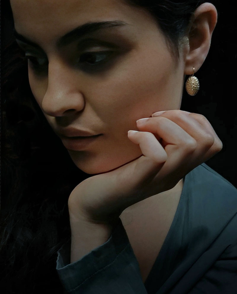 Øreringenes afrundede konturer giver et indtryk af en form, der er fundet snarere end skabt. Superellipsens præcision fremkalder et smykke, der er både intellektuelt tiltalende og visuelt forførende. De er en æstetisk leg mellem det naturlige og det raffinerede, en form der hviler i sin egen balance. Hvor felterne i det fine turtle-mønster bliver tiltagende mindre mod midten, samler smykket sig i tre indlejrede hvide topas.