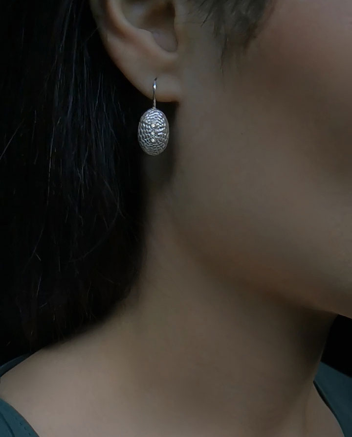The rounded contours of the silver earrings give the impression of a shape that is found rather than created. The precision of the super ellipse evokes a piece of jewelry that is both intellectually appealing and visually seductive. They are an aesthetic play between the natural and the refined, a form that rests in its own balance. Where the small elevations towards the center become increasingly smaller, the jewelry gathers in three embedded white topaz.