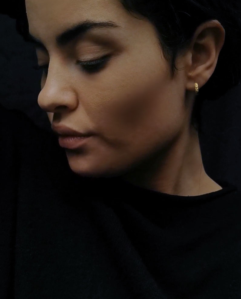 Jeg har tilstræbt at designe overfladen på de små hoops, sådan som guld fra arkæologiske fund har forandret sig over tid. Hver lille fordybning reflekterer lyset på en særegen måde og tilfører kreolerne et levende, skiftende udtryk. Smykket er som dele af en skat, der bæres som symbol på vores ufortalte historier. Et udtryk for det smukke i det uperfekte og en hyldest til fortidens mystik.
